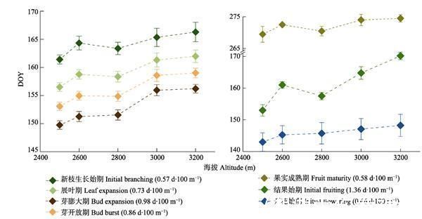 图2.青海云杉物候期随海拔梯度的变化