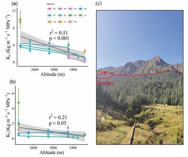 中国科学院西北生态环境资源研究院临泽内陆河流域研究站相关团队开展了祁连山北坡亚高山灌木群落物种多样性对气候变化响应、青海云杉物候表型空间分异及其内在机制、高山树线形成的生理学机制等方面的研究并取得进展。科研人员对比分析了2002年和2017年亚高山灌木群落物种组成变化,发现祁连山气候变暖改变了优势灌木群落的物候格局,表现在低海拔区耐阴喜湿草本物种增多,喜阳物种减少,高海拔则相反(Du et al., 2021, INT J BIOMETEOROL)(图1);青海云杉表观物候期均随海拔升高而推迟0.57-1.36 d/100m,生长季开始前的热量积累及降水量、冻害发生频率是影响物候动态的关键因子(杜军,等,2021,植物生态学报)(图2);林线对气候变化响应敏感,决定着森林群落的变化。对北坡十余种优势木本植物的研究表明,随海拔升高、气温降低,植物水分传导力和光合作用下降,这可能是影响高山树线的生理机制(Feng et al., 2022, FOREST ECOL MANAG)(图3)。