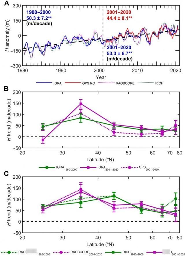 因此,在这项新研究中,研科学家调查了对流层上升的速度,以及这是否随着时间的推移而改变。当然,他们发现在过去的40年里,它每十年上升大约50到60米--至少在北半球是这样。